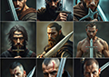 Мечи на месте — но и бóроды, увы, тоже, хотя подсказка в данном случае сформулирована как «a beardless man with a sword»; более того, попытка одновременно выловить из латентного пространства меч и безбородость порождает явные артефакты — обратите внимание и на само оружие, и на кисти держащих его рук (источник: ИИ-генерация на основе модели FLUX.1 [schnell])