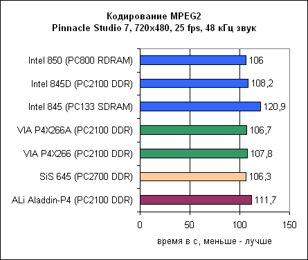 Что касается создания MPEG-2 фильмов в Pinnacle Studio 7, то здесь Intel Pentium 4/2200 оказался значительно быстрее AMD Athlon XP 2000+. И снова чипсет ALi стал аутсайдером.