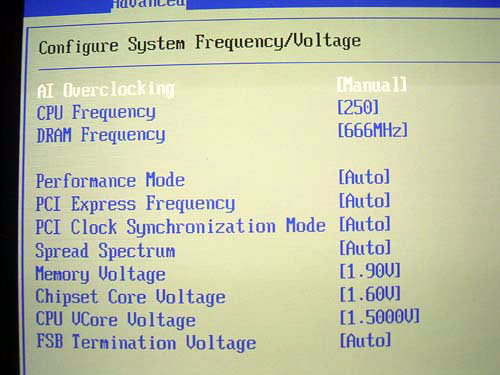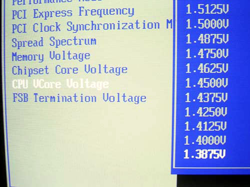 Во-вторых, плата Asus P5AD2 позволяет изменять напряжение на процессоре(Vcore) в очень широком диапазоне: от 1.3875V (штатное) до 1.7V с шагом 0.0025V.