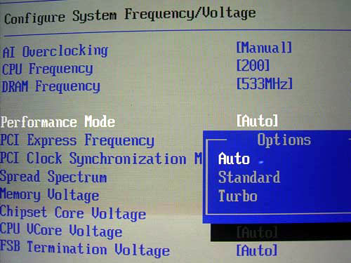 Еще несколько моментов связанных с разгоном. Во-первых, в соответствующем разделе биоса есть интересный пункт: Perfomance Mode. При установке его в значение Turbo, плата просто-напросто увеличивала частоту FSB на 2 Мгерц.