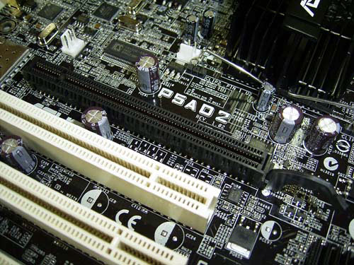 То есть, по сравнению с дизайном плат на i865PEi875P никаких принципиальных отличий. Даже максимальный объем памяти остался равным 4Гбайт. Как только на плату подается напряжение - загорается большой зеленый светодиод, установленный около слотов PCIE x1.
