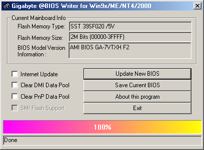 Совершенно непонятно почему микросхемы впаяны. Конечно, Dual BIOS это хорошо: при неудачной прошивке новой версии биоса или при выходе из строя одной микросхемы можно воспользоваться резервной микросхемой биоса. Но, если может сгореть одна микросхема, то почему не могут сгореть обе. И тогда замена микросхем биоса превращается в весьма сложную операцию. Конечно, такой вариант маловероятен, но в любом случае впаянные микросхемы нельзя назвать хорошей идеей. Кстати, некоторые сайты (в частности Томshardware) сообщали и еще об одном недостатке DUAL BIOS. Как они говорили, при прошивке биоса от другой материнской платы - система с резервного BIOS не загружалась и восстановить исходную версию биос не удавалось. По вполне понятным причинам, я не стал повторять этот эксперимент. Заканчивая говорить о Dual BIOS, замечу, что эта (и подобные ей) технология позволяет совершенно спокойно пользоваться программами обновления BIOS через интернет (если только не ошибся вебмастер Gigabyte, и не предложил версию от другой платы :).