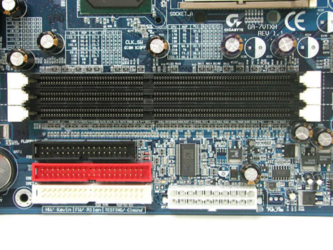 Теперь поговорим о памяти. Инженеры Gigabyte особо не мудрствовали и установили на плату 3 разъема DIMM (как и остальные производители). В результате на плату можно установить до 3 Гбайт оперативной памяти. Разъемы DIMM расположены достаточно далеко от универсального слота AGP и установленная видеокарта никак не мешает установке памяти. Рядом расположены разъемы для подключения IDE устройств и дисковода. Тут же находится разъем питания. В результате - мешанина из кабелей весьма неприятна, но в принципе терпима. Тем более, что шлейфы и кабели совсем не мешают циркуляции воздуха.