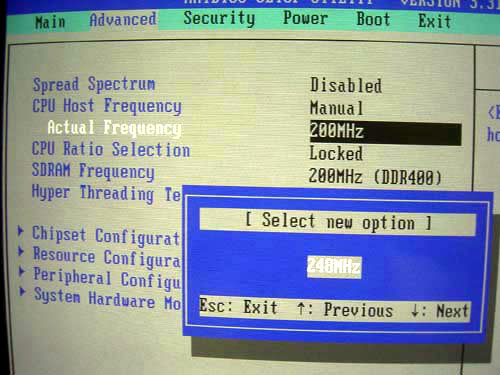 А что касается функций разгона, то на плате ASRock P4i45G они практически отсутствуют. Из соответствующий функций есть только изменение частоты FSB. Диапазон изменения от 100 до 248Мгерц с шагом 1Мгерц.