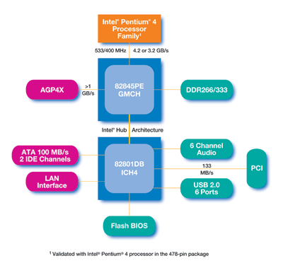 В отличии от чипсетов i845E и i845G, новые чипсеты i845PE и i845GE имеет идентичную структуру. Т.е. они полностью совместимы по выводам и отличаются только наличием графического ядра у i845GE.