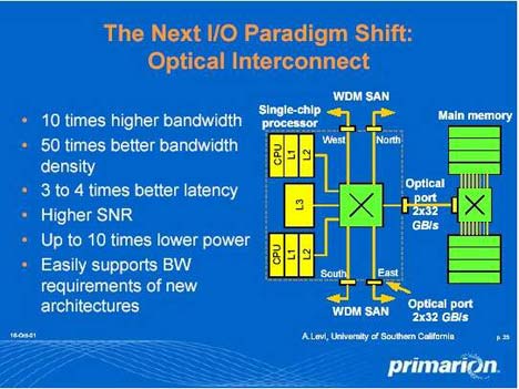 Билл Полман (Bill Pohlman), основатель, директор и руководитель технического отдела Primarion, имеет свой взгляд на вещи, и, конечно же, склоняется к продукции своей компании - к оптическим устройствам.Полман рассказал о препятствиях на пути достижения 10 ГГц. Собственно говоря, к этому все и стремятся, пусть даже и понимают, что гигагерцы не главное в этой жизни. Итак, Полман живо описал 10 ГГц процессор 2005 года.