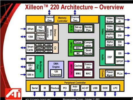Ну что, жаждали интегрированности? Пожалуйста! Xilleon 220 сможет удовлетворить практически все ваши нужды в области цифрового телевидения с помощью единственного чипа - так называемое решение система в чипе (System On a Chip). У всех нас остались превосходные впечатления работы их графических плат с цифровым видео, поэтому небезынтересно наблюдать шаги компании по этому конкурентному неблагодарному рынку.