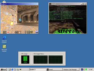 1 CPU Quake2 17.4 Unreal 24.1Как видно, разница более чем приличная. Результат Quake2 при двухпроцессорной обработке вырастает на 162.06% (Unreal работает), Unreal (Quake2 работает) в свою очередь - на 32.78%. Однако, в процессе тестирования мы заметили, что если при работе обоих игрушек на одном процессоре что-либо начинаешь делать в Quake2, хотя бы просто набирать команду в консоли, то скорость в Unreal сильно падает. Чтобы проверить этот факт, мы остановили в Quake2 режим timedemo и загрузили q2dm1.dm2, после чего просто побегали по карте. В результате всех наших манипуляций Unreal практически остановился - текущий fps с 30 упал до 0.08! Когда мы перестали двигаться в Quake2, но оставили загруженной Q2dm1, fps в Unreal вырос до 0.28. Один кадр рисовался несколько секунд.