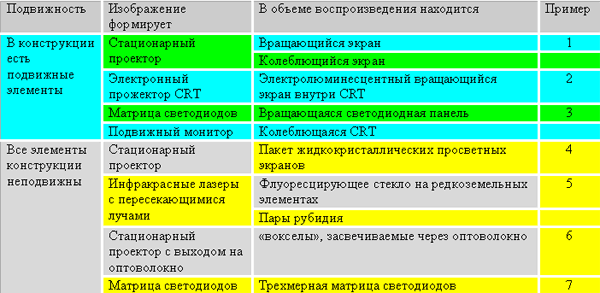 Для V3D нам потребуется дополнительная классификация, поскольку это самая многочисленная по разнообразным технологиям группа. Примем за основу классификации три параметра: наличие в конструкции движущихся частей, тип источника изображения, заполнение объема воспроизведения. Естественно, такая классификация условна и не претендует на полноту и окончательность. В таблице приведены некоторые примеры технологий V3D.