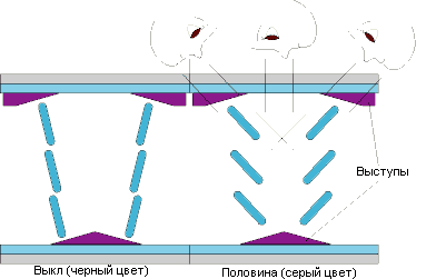 Иллюстрация 1: в панелях TN+film жидкие кристаллы выстраиваются перпендикулярно подложке. Слово «пленка» в названии произошло от дополнительного слоя, служащего для увеличения угла обзора.