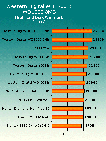 High-end диски WD1000, WD1000 8 Мб и WD1200 обеспечивают быстрый доступ к диску на 12,8 и 13,2 мс. Обратите внимание, эти числа показывают общее время, которое проходит перед чтением данных, что включает переключение головок и задержку при вращении (производители обычно приводят только время поиска).