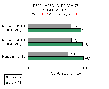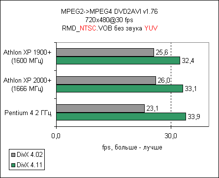 При использовании версии DivX 4.02, Pentium 4/2000 не смог угнаться за Athlon XP 1900+/2000+. Но DivX 4.11 изменил ситуацию. Без обработки аудиопотока, все процессоры смогли взять барьер реального времени (30 fps для NTSC) в цветовом пространстве YUV. Причем улучшение здесь заметно не только для Pentium 4/2000, но и для Athlon XP.