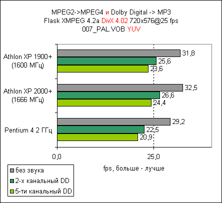 В тестировании мы использовали еще один фильм. Мы взяли отрывок с погоней BMW из фильма про Джеймса Бонда. Такой отрывок критичен к пропускной способности. Обратите внимание - формат фильма PAL, где порог реального времени - 25 fps. Как видим, с 4.11 версией DivX улучшились результаты и Athlon XP, и Pentium 4. И вновь Pentium 4 вышел на первое место.