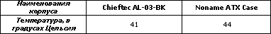 Уже на первом тесте заметно, что Chieftec обходит по результатам дешевые китайские аналоги, чего и следовало ожидать. С другой стороны, отставание является не таким уж критичным - видимо, причиной тому является отсутствие какого-либо вентилятора на передней панели корпуса, а значит отсутствие правильного, направленного потока воздуха, проходящего через всю внутреннюю полость. Также, немалую роль в этом может играть большая концентрация проводов, отходящих от материнской платы и блока питания к различным устройствам системы.
