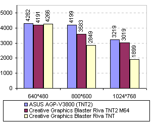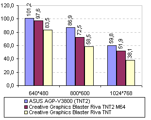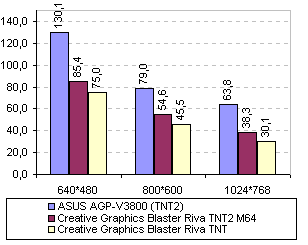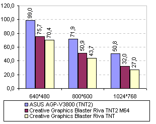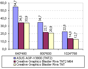 Тут картинка еще больше меняется в худшую сторону: TNT2 сильно вырвалась вперед, TNT2 M64 в 16-битных режимах все еще опережает TNT с существенным, но уже меньшим отрывом, а при 32-битном цвете TNT уже вообще не отстает и результаты их почти не отличаются.