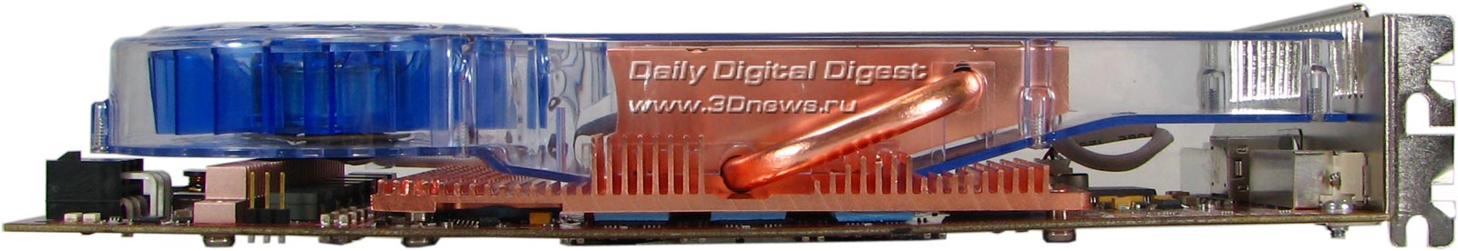 Ширина сопла, через которое нагретый воздух выбрасывается за пределы системного блока почти в 2 раза больше чем у стандартного кулера X1900XTX. Что это значит? А то, что для обеспечения того же потока воздуха, что и в обычном X1900XTX, кулеру требуется прикладывать меньше усилий, а значит можно либо снизить его скорость и уменьшить шум, либо при той же скорости вращения кулера получить лучшее охлаждение GPU. Однако, заботясь об охлаждении видеопроцессора, не стоит забывать об охлаждении и других важных компонентах. Длина кулера на HIS X1900XTX IceQ3 такова, что для охлаждения силовых элементов подсистемы питания видеокарты привычную гребенку радиатора пришлось несколько урезать.