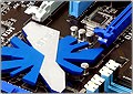 Отметим также исключительно удачную разводку слотов PCI Express и PCI: даже при установке двух дискретных видеокарт с двухслотовыми системами охлаждения, незаблокированными остаются как слоты PCI, так и PCI-E x1. Это снимает ограничения на тип подключения дискретной звуковой карты или других плат расширения. Отметим, что нижний слот расширения выкрашен в темно-синий цвет, отличающийся от остальных - это PCI Express x1 2.0.