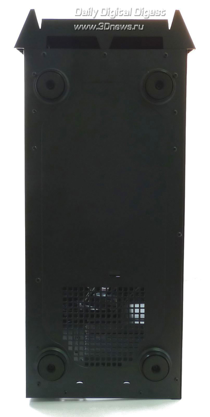 Снизу у корпуса четыре большие резиновые ножки и вентиляционные отверстия для блока питания, не прикрытые фильтром: если установить блок питания вентилятором вниз, то запылится он очень скоро. В описании корпуса, однако, фильтр упоминается - будем надеяться, что он просто потерялся по дороге в нашу тестовую лабораторию.