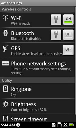 Начнем с дополнительного набора настроек под названием "Acer Settings". Дополнительным его, собственно, и не назовешь - это просто самые основные настройки, собранные в одно меню и оформленные в характерном "андроидовом" стиле. Здесь можно найти выключатели Wi-Fi, Bluetooth и GPS, настройки яркости и времени отключения экрана, выбор мелодии звонка и настройки сети сотовой связи. Особой пользы от этих отдельных настроек нет, но кому-то может показаться удобным, что все они собраны в одном месте, и не надо лазать по собственному ветвистому меню настроек Google Android.