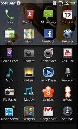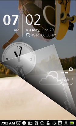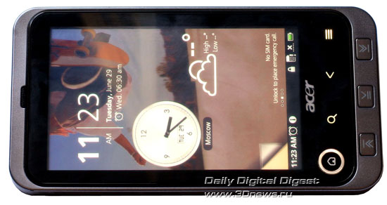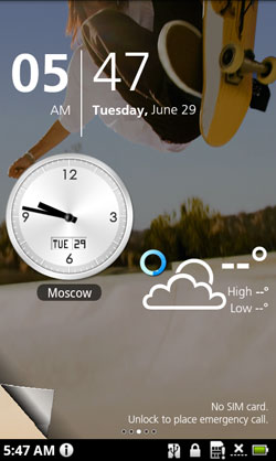 Выглядит рабочий экран тоже очень необычно. В его верхней части находятся только часы и дата, а в нижней расположились восемь иконок и стандартная информационная полоска, в нормальных смартфонах на Android находящаяся в самом верху. Вспомните ящик с приложениями в Android 1.6, который надо было тащить вверх. Иконки в нижней части главного экрана Acer Stream напоминают именно такой ящик, который кто-то вытащил на одну треть и забыл на рабочем столе. Ящик действительно можно вытянуть вверх. Разработчики Google сочли такое решение непрактичным и заменили ящик из версии 1.6 на простую кнопку в версии 2.1, однако визуальной эффектности у ящика не отнять, и Acer сделала ставку именно на это. К тому же, в случае со Stream, вытаскивается он всегда с первого раза.