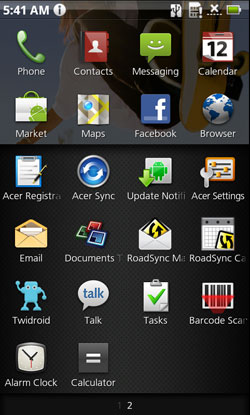 С рабочими столами и меню разобрались, но на этом список изменений относительно базовой ОС Android 2.1 не заканчивается: Acer установила еще некоторое количество дополнительных приложений, которые также должны расширить функциональность смартфона и увеличить удобство использования.
