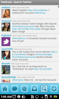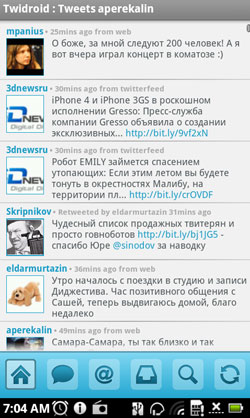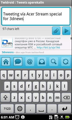 Среди прочих интересных приложений, предустановленных в Acer Stream, нашелся и Twitter-клиент с говорящим названием Twidroid. Клиент, кстати, достаточно удобный и существует в двух версиях - бесплатной и платной, российским пользователям почти недоступной. Ключевым отличием платной версии является нативная поддержка сайта, укорачивающего ссылки - www.bit.ly. Но отсутствие этой поддержки - не такая уж и потеря, чтобы за нее платить целых четыре доллара. У Twidroid есть и соответствующие виджеты для рабочего стола: в платной версии - три разных, в бесплатной - всего один. Четырех долларов они тоже не стоят. Вообще-то, бесплатная версия клиента устраивает большинство пользователей и без каких-либо проблем скачивается из Android Market, но разработчики из Acer решили установить платную и предварительно, так что пользователю доступны и все виджеты, и работа с www.bit.ly. Кстати, Twidroid - редкий пример программы, которая на нашем предпродажном образце работала с положенной скоростью, а не в десять раз медленнее.