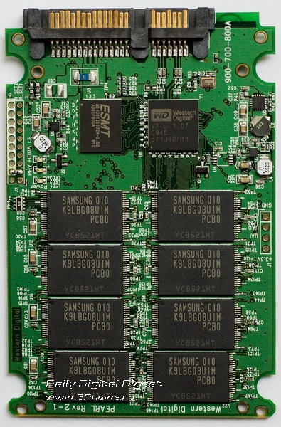 Пока выпускается три модели, отличающиеся друг от друга только объемом – 64 Гбайт ($160), 128 Гбайт ($330) и 256 Гбайт ($750). Скоростные характеристики у всей троицы практически идентичные, что, в общем-то, и не удивительно – везде используется одинаковый контроллер JMicron 612. Правда, в WD предпочли перемаркировать его под себя, намекая на определенную доработку, однако суть-то осталось прежней. Буфер у SiliconEdge Blue неожиданно большой для SSD, да вдобавок еще и быстрый: под него задействован чип DDR2 производства ESMT объемом 64 Мбайт. Везде используется одинаковое число чипов MLC-флеш производства Samsung, только объем их составляет 4, 8 или 16 Гбайт, в зависимости от модели.