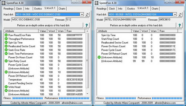 Конечно, если взять в руки и SSD, и HDD, перепутать их трудно, но сходство все равно сильное. Лично меня очень позабавило, что в WD забыли отредактировать список отслеживаемых показателей в S.M.A.R.T, и сейчас там есть даже «Время раскрутки шпинделя» (Spin Up Time). Сравните – какие показатели оставили в SSD Intel X-25M. Пожалуй, их более, чем достаточно.