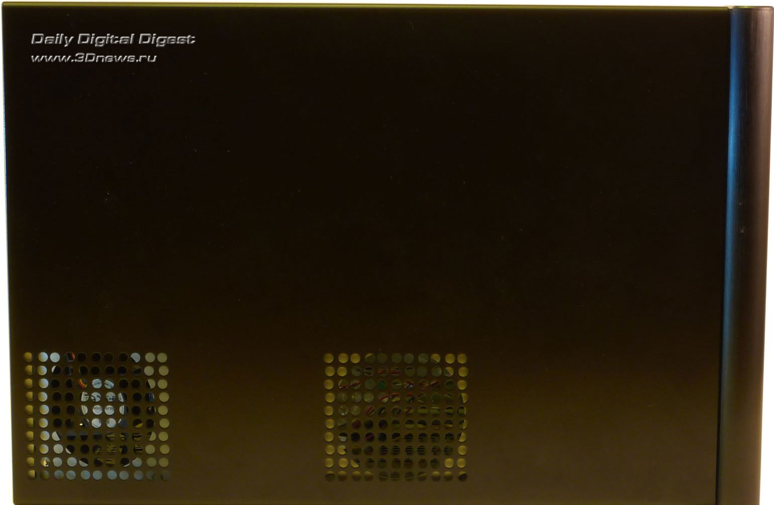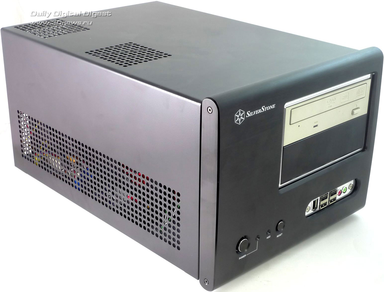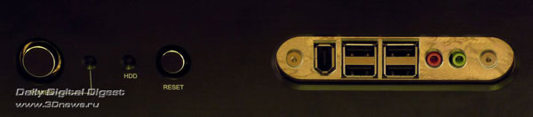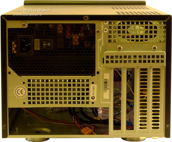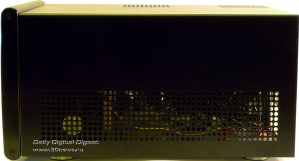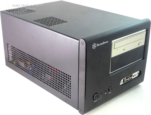 Никаких заглушек, крышек и прочих условно полезных аксессуаров. Возможно, такой минимализм оправдан: без документации корпус не разрешили бы продавать, все остальные аксессуары в комплекте относятся к разряду необходимых, а к большей части комплекта поставки остальных корпусов пользователи никогда и не притрагиваются. ⇡#ДизайнСам корпус имеет исключительно небольшие размеры и вытянутую форму: ведь он предназначен для установки мощных видеокарт, длиной вплоть до 12 дюймов (30 см). По внешности SilverStone Sugo SG-01F больше всего напоминает barebone-платформы Shuttle, так и не завоевавшие популярности на российском рынке. Корпус предлагается в двух вариантах окраски: черный или серебристый. Нам достался черный вариант, который, как нам кажется, несколько красивее серебристого. Передняя панель Sugo SG-01F строгая, черная, сделанная из алюминия со следами фрезы. Она была бы совсем строгой, если бы не две яркие хромированные вставки: одна окаймляет две заглушки для 5,25-дюймовых устройств, а на второй разместились все разъемы: четыре порта USB 2.0, два аудио-разъема и один порт Fire-Wire (IEEE1394). За четыре разъема USB инженерам SilverStone можно только поаплодировать: это самые нужные порты на передней панели, и ради них можно пожертвовать портом eSATA. С другой стороны, eSATA тоже полезен, и лучше бы он оказался на месте постепенно уходящего в прошлое Fire-Wire, но это уже придирки. Слева от вставки с разъемами располагаются кнопки включения и перезагрузки компьютера вместе с индикаторами состояния компьютера и активности накопителей. Небольшой диссонанс в гармоничный дизайн корпуса вносят как раз следы от фрезы: на корпусе они горизонтальные, а на заглушках — вертикальные. В остальном придраться не к чему. На боковых панелях расположены блоки вентиляционных отверстий длиной во весь корпус. Если учесть, что стандартного потока воздуха из передней части корпуса в заднюю здесь не предполагается, то, может быть, это и неплохо. На верхней части корпуса также нет ничего, кроме двух секций вентиляционных отверстий, за одной из которых скрывается 80 мм вентилятор, а за другой — посадочное место для установки еще одного 80 мм вентилятора. На дне корпуса никаких функциональных элементов нет, только четыре больших резиновых ножки с металлической окантовкой — такие чаще всего можно найти на различной Hi-Fi технике. Наиболее интересной частью внешности корпуса является задняя сторона: по ней сразу можно хотя бы частично понять, как устроен корпус внутри. Место для панели ввода/вывода материнской платы расположено в самом низу, а правее него находятся четыре перфорированные заглушки, занимающие место неустановленных плат расширения. Перфорация равномерно распределена по всей задней панели: она есть и над заглушками, и над местом для панели ввода/вывода. Также на заднюю сторону корпуса выходят и вентиляционные отверстия черного блока питания. Лучше бы, конечно, сама задняя панель и все внутренности корпуса тоже были черными — дизайн корпуса стал бы более лаконичным и законченным. Однако и с серой окраской внутри SilverStone SG01-F не смотрится полуфабрикатом. Верхняя панель и две боковые стенки образуют единое целое. Чтобы их снять, придется вооружиться отверткой — удобных барашковых винтов здесь не предусмотрено. Свободного места внутри корпуса не слишком много — в основном, за счет предуста