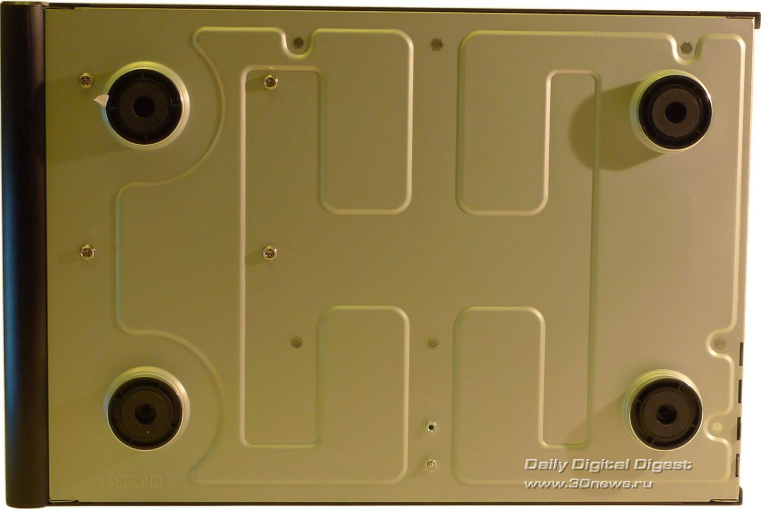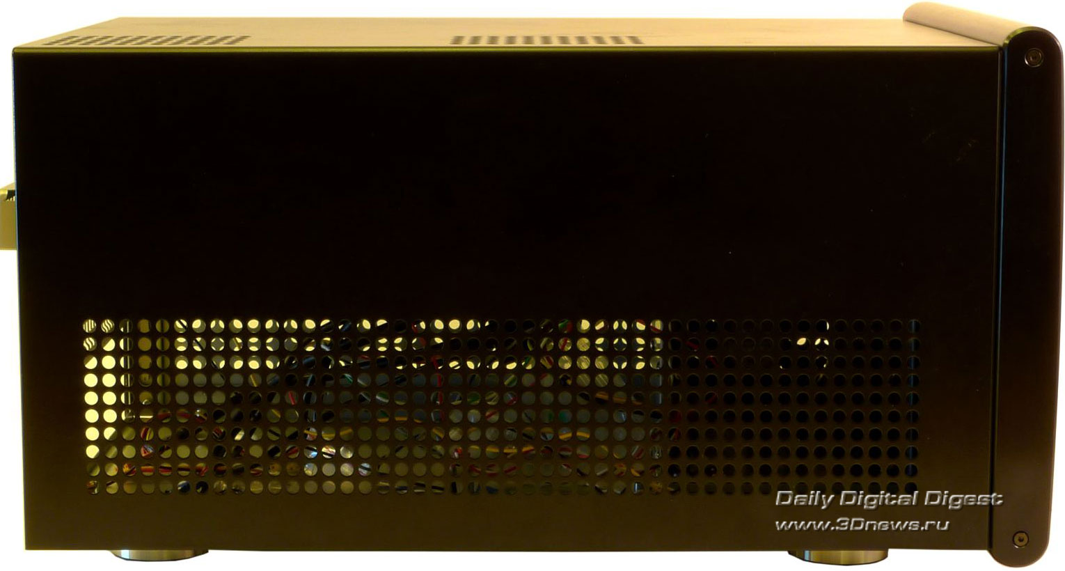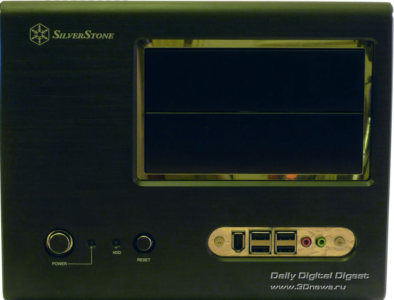 Никаких заглушек, крышек и прочих условно полезных аксессуаров. Возможно, такой минимализм оправдан: без документации корпус не разрешили бы продавать, все остальные аксессуары в комплекте относятся к разряду необходимых, а к большей части комплекта поставки остальных корпусов пользователи никогда и не притрагиваются. ⇡#ДизайнСам корпус имеет исключительно небольшие размеры и вытянутую форму: ведь он предназначен для установки мощных видеокарт, длиной вплоть до 12 дюймов (30 см). По внешности SilverStone Sugo SG-01F больше всего напоминает barebone-платформы Shuttle, так и не завоевавшие популярности на российском рынке. Корпус предлагается в двух вариантах окраски: черный или серебристый. Нам достался черный вариант, который, как нам кажется, несколько красивее серебристого. Передняя панель Sugo SG-01F строгая, черная, сделанная из алюминия со следами фрезы. Она была бы совсем строгой, если бы не две яркие хромированные вставки: одна окаймляет две заглушки для 5,25-дюймовых устройств, а на второй разместились все разъемы: четыре порта USB 2.0, два аудио-разъема и один порт Fire-Wire (IEEE1394). За четыре разъема USB инженерам SilverStone можно только поаплодировать: это самые нужные порты на передней панели, и ради них можно пожертвовать портом eSATA. С другой стороны, eSATA тоже полезен, и лучше бы он оказался на месте постепенно уходящего в прошлое Fire-Wire, но это уже придирки. Слева от вставки с разъемами располагаются кнопки включения и перезагрузки компьютера вместе с индикаторами состояния компьютера и активности накопителей. Небольшой диссонанс в гармоничный дизайн корпуса вносят как раз следы от фрезы: на корпусе они горизонтальные, а на заглушках — вертикальные. В остальном придраться не к чему. На боковых панелях расположены блоки вентиляционных отверстий длиной во весь корпус. Если учесть, что стандартного потока воздуха из передней части корпуса в заднюю здесь не предполагается, то, может быть, это и неплохо. На верхней части корпуса также нет ничего, кроме двух секций вентиляционных отверстий, за одной из которых скрывается 80 мм вентилятор, а за другой — посадочное место для установки еще одного 80 мм вентилятора. На дне корпуса никаких функциональных элементов нет, только четыре больших резиновых ножки с металлической окантовкой — такие чаще всего можно найти на различной Hi-Fi технике. Наиболее интересной частью внешности корпуса является задняя сторона: по ней сразу можно хотя бы частично понять, как устроен корпус внутри. Место для панели ввода/вывода материнской платы расположено в самом низу, а правее него находятся четыре перфорированные заглушки, занимающие место неустановленных плат расширения. Перфорация равномерно распределена по всей задней панели: она есть и над заглушками, и над местом для панели ввода/вывода. Также на заднюю сторону корпуса выходят и вентиляционные отверстия черного блока питания. Лучше бы, конечно, сама задняя панель и все внутренности корпуса тоже были черными — дизайн корпуса стал бы более лаконичным и законченным. Однако и с серой окраской внутри SilverStone SG01-F не смотрится полуфабрикатом. Верхняя панель и две боковые стенки образуют единое целое. Чтобы их снять, придется вооружиться отверткой — удобных барашковых винтов здесь не предусмотрено. Свободного места внутри корпуса не слишком много — в основном, за счет предуста