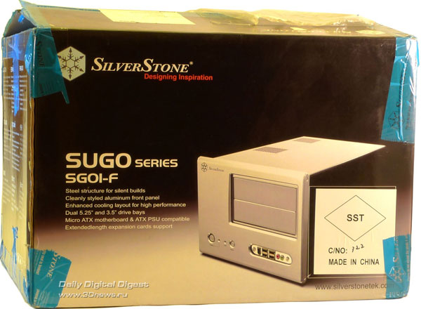 Какими раньше были компьютерные корпуса? Серыми, по большей части средних размеров и очень мало отличающимися друг от друга. Со временем в дизайне корпусов появились фирменные изыски, модели производства, например, Thermaltake, стало легко отличить от корпусов SilverStone или Lian Li. Но набор возможных форм-факторов оставался прежним: «малая башня», «средняя башня», «большая башня» и «десктоп» - горизонтальный корпус. Большинство корпусов, которые можно найти на прилавках магазинов сегодня, до сих пор относятся к одному из перечисленных форм-факторов, но постепенно производители поняли, что можно выйти за привычные рамки и создать что-то принципиально новое, нестандартное. Примером такого подхода стала линейка корпусов Silverstone Sugo, в которых реализована интересная концепция: попытка уместить мощное железо в маленьком объеме. Инженеры SilverStone замахнулись на нелегкую задачу, ведь мощным комплектующим требуется хорошее охлаждение, а чем больше объем корпуса, тем проще это охлаждение реализовать. К тому же, в крупных корпусах без проблем размещаются вентиляторы с большим диаметром крыльчатки, а в корпусах маленького размера для них просто не найдется свободного места. Тем не менее, линейка Sugo насчитывает уже не одну модель, а значит, инженерам удалось реализовать задумку. На сей раз у нас в гостях последняя модель из этой линейки – SilverStone Sugo-SG01F. Посмотрим, способен ли маленький корпус противостоять «большим башням». ⇡#Упаковка и комплект поставкиКорпус приехал к нам в тестовую лабораторию в небольшой коробке серебристо-черной расцветки, со всех сторон обклеенной синем скотчем. Внутри коробки между пенополиуретановыми держателями прочно зафиксирован сам корпус, для надежности также упакованный в плотный полиэтиленовый пакет. После того, как мы достали корпус из коробки, в ней обнаружилась первая часть комплекта поставки: шнур питания, свидетельствующий о том, что в корпусе установлен блок питания. Остальная часть комплекта спрятана внутри корпуса: чтобы до нее добраться, придется открутить три винта и снять верхнюю крышку. Комплектация корпуса весьма скудная. В нее входят следующие аксессуары: