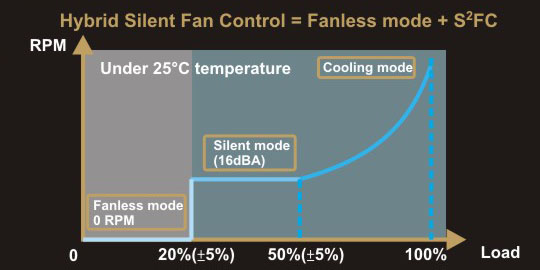 Безвентиляторный режим упомянут отнюдь не для красного словца или "галочки", ибо он оказался одной из тех особенностей модели SeaSonic X-750, которые в процессе тестирования вызвали особое удивление и восхищение. На рисунке ниже вы можете видеть схему, приведённую производителем, где утверждается, что полностью бесшумный режим без задействования вентилятора характерен при нагрузке БП от нуля до 20% номинальной мощности.