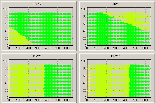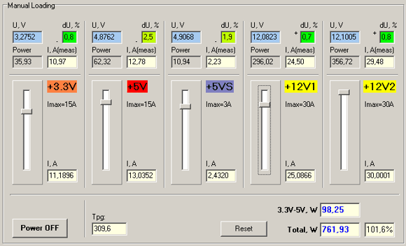 Заявляя о разбросе рабочих напряжений в пределах 3% от номинала, производитель здорово поскромничал, так как на практике отклонение по всем каналам во всех мыслимых сочетаниях канальных нагрузок не превысило одного процента.