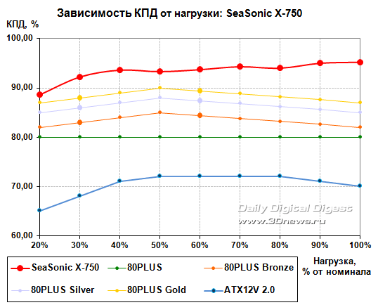 Наконец, практические результаты измерения КПД блока питания SeaSonic X-750. Как говорится, комментарии излишни, во всём рабочем диапазоне эффективность этой модели "на голову" превышает требования стандарта 80PLUS Gold.