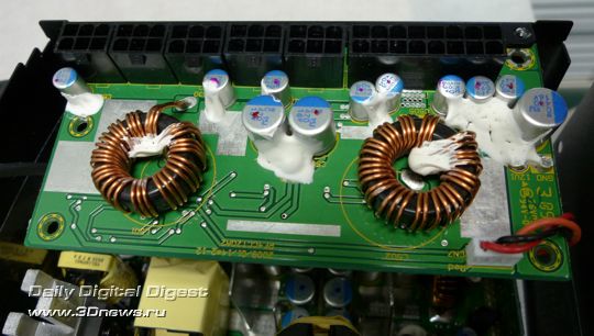 Печатная плата имеет современный двухсторонний дизайн, позволяющий оптимизировать расположение элементов схемы. На снимках хорошо заметны достаточно скромные для 750-Вт блока питания габариты теплоотводящего радиатора – с высоким КПД "золотого уровня" в этой схеме особо нагреваться, по сути, нечему.