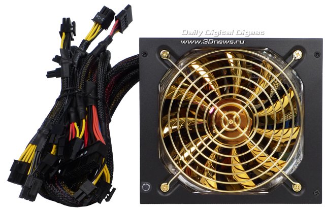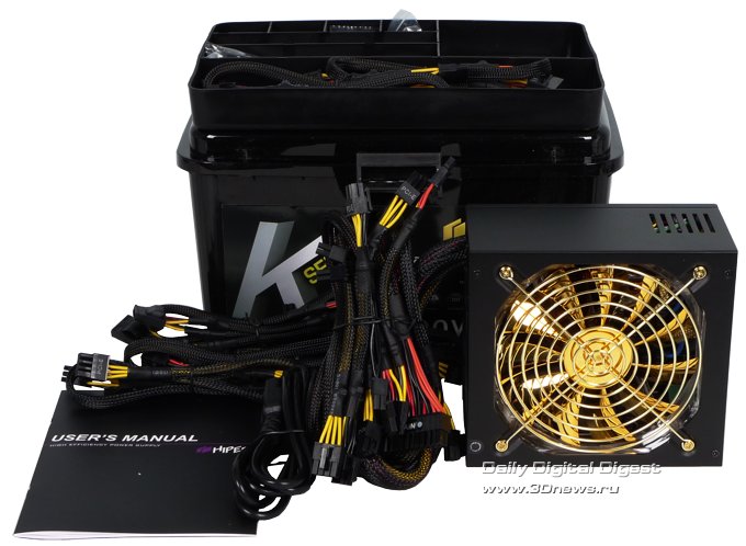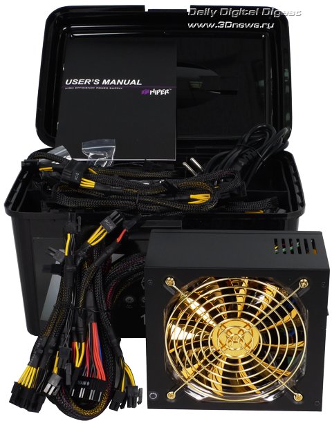 Упаковка, комплектация, впечатления Упаковка блока питания Hiper K1000 выполнена в лучших традициях компании Hiper, пластиковую коробку HIPER ToolBox не спутать ни с чем, а после инсталляции в вашем распоряжении остаётся "инструментальный ящик", в котором, помимо оставшихся после монтажа кабелей, можно хранить всякую всячину. ![]() Опять же по традиции, на лицевой стороне упаковки размещена информация о номинальной мощности 1 кВт, модульной системе кабельного хозяйства, возможности построения конфигураций с несколькими видеокартами и поддерживаемых технологиях, включая сертификацию по стандарту 80PLUS. Тыльная сторона упаковки расписывает, собственно, дизайн кабелей, а все данные о входных и выходных параметрах блока питания размещены на левой боковой плоскости коробки. ![]() Комплект поставки Hiper K1000 включает сам блок питания, силовой кабель, два пакетика с крепежом, стяжки-липучки для монтажа кабелей внутри корпуса, а также комплект съёмных кабелей и бумажные руководства пользователя. ![]() Корпус блока питания выполнен из прочной стали, толщина стенки составляет добротный миллиметр, а выкрашен он черной матовой краской. Компоновка устройства построена по схеме, классической для модульных БП с крупным вентилятором на нижней плоскости: "внешний" торец корпуса с выключателем и разъёмом под силовой кабель питания усеян крупными "сотовыми" вентиляционными отверстиями, противоположный торец с разъёмами для подключения кабелей без вентиляции, на перпендикулярных плоскостях лишь несколько небольших прорезей. Вентилятор в этой системе применён крупный, диаметр лопастей 135 мм, лопасти покрыты золотистой краской.