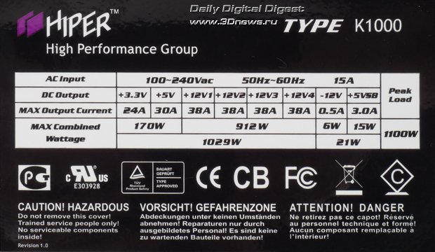 Стоит отметить, что даже после продолжительной работы при большой нагрузке нагрев системы пребывал в разумных пределах, и выдуваемый воздух оставался слегка тёплым. Шум системы охлаждения БП в диапазоне от минимальной нагрузки до двух третей номинала услышать затруднительно. ⇡#Методика тестированияСо времен наших последних статей о блоках питания методика тестирования, применяемая в лаборатории 3DNews, изменений не претерпела. Ознакомиться с ней в полном объёме можно, например, в этой статье. Оформление графика, составляемого по результатам исследования коэффициента полезного действия (КПД) тестируемых блоков питания, содержит эталонные показатели по стандартам семейства 80PLUS, а также минимальные требования базового стандарта ATX12V версии 2.2. Также стоит отметить, что нагрузочные способности блока питания Hiper K1000 превышают возможности нашего испытательного стенда, так что эффективность этой модели мы смогли замерить только в доступном нам диапазоне, то есть до 850 Вт. ⇡#Результаты тестированияЗаполняем параметры нагрузки тестового стенда согласно маркировке модели. ![]() Начнем с графиков тестирования блока питания Hiper K1000 в автоматическом кросс-нагрузочном режиме. ![]() Никаких неожиданностей: высокая стабильность выходных результатов с минимальным отклонением во всём диапазоне рабочих нагрузок, доступном для измерения нашим тестовым стендом. Результаты тестирования в режиме статической нагрузки, сопряжённые с процессом снятия характеристик для построения графика КПД, также продемонстрировали высокую стабильность выходных параметров при любом сочетании нагрузки по разным каналам. ![]() Наконец, график эффективности блока питания К1000. Показания КПД сняты и высчитаны в доступном для нашего испытательного стенда диапазоне нагрузок. ![]() Результат во всём диапазоне измерений превзошёл требования не только базового стандарта 80PLUS, но даже более серьезные спецификации стандарта 80PLUS Bronze. ⇡#ИтогиДля нас так и осталось загадкой, почему компания HIPER не получила на блок питания K1000W более высокий "бронзовый" сертификат. На практике эту модель стоит воспринимать именно как представителя категории 80PLUS Bronze, со всеми вытекающими. Тестируемая модель показала отличные результаты в различных режимах нагрузки и высокий КПД. Кроме того, блок питания HIPER K1000W также интересен высококачественной компонентной базой, добротной сборкой, избыточно широкой комплектацией кабельного хозяйства и низким уровнем шума, а для любителей шоу – ещё и светодиодной подсветкой лопастей вентилятора. Плюс шикарная многоцелевая пластиковая упаковка ToolBox. Блок питания можно считать одним из самых дешевых "киловаттников" – его цена на момент написания статьи составляла порядка 6000 рублей. Наш вердикт: понравился – берите, таких денег этот БП безусловно стоит.