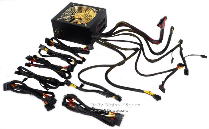 ![]() ![]() В плотном жгуте, выходящем из корпуса БП, представлены все основные кабели питания системы, включая основной 24-контактный, кабели дополнительного питания системной платы, процессора, видеокарт, периферии. ![]() ![]() Вместе с дополнительными съёмными кабелями обеспечивается следующий комплект разъёмов питания: