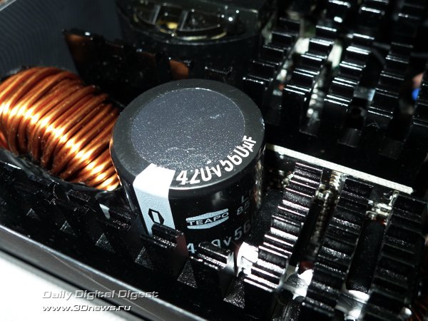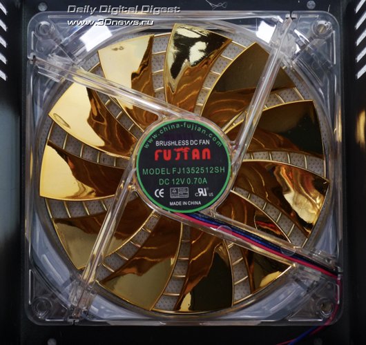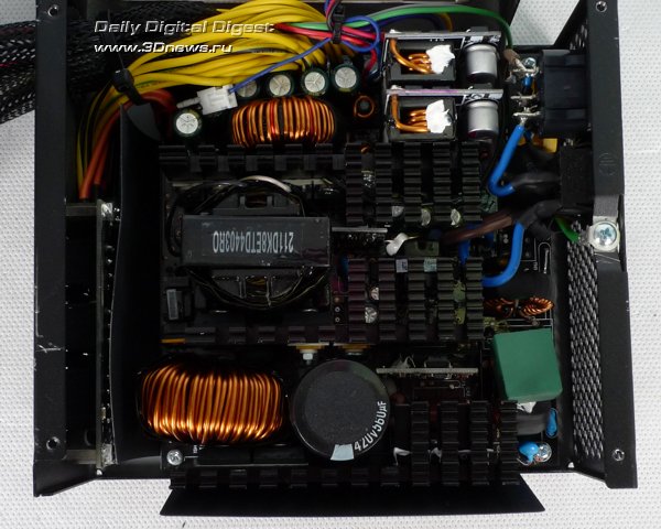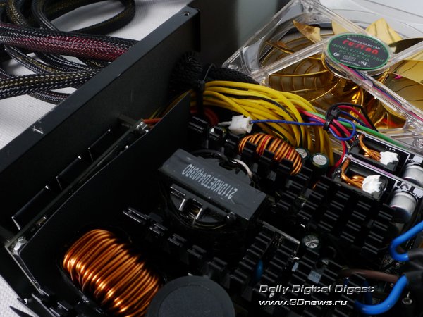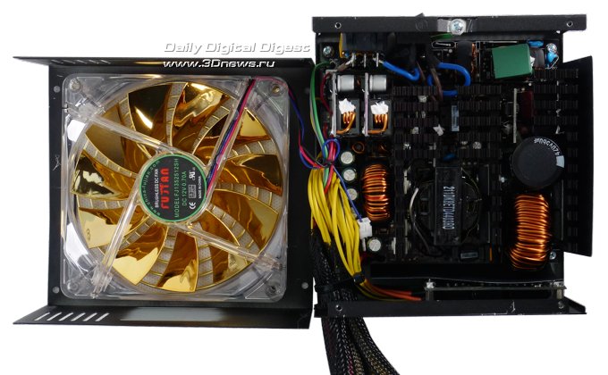 Взгляд на мощную систему радиаторов блока питания позволяет понять, почему воздушный поток от лопастей вентилятора Hiper K1000 не перекрыт, как это обычно бывает у таких моделей, пластиковой накладкой. Ни половина, ни даже четверть крыльчатки не закрыта, поскольку охлаждение радиаторов требуется по всей площади обдува системы охлаждения.