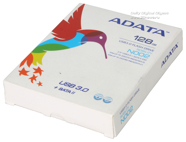 Дискеты, компакт-диски, USB-флешки, внешние жёсткие диски и наконец внешние SSD-накопители — эта внушительная, хотя и неполная эволюционная цепочка потребовала куда меньшего временного интервала, чем (если верить сторонникам теории Чарльза Дарвина) эволюция человека, но она наглядно демонстрирует существенный прогресс в области создания портативных носителей за последние 10-15 лет. И здесь есть чему удивляться. За какой-то десяток лет объёмы мобильных накопителей выросли в 300-700 тысяч раз, а скорости чтения в 1,5-3 тысячи раз! К нам в тестовую лабораторию попал внешний SSD-носитель ADATA N002, но не простой, а с набирающим популярность интерфейсом USB 3.0, обеспечивающим в теории десятикратный прирост в скорости по сравнению с предыдущей версией этого интерфейса. Пока что с новой последовательной шиной работает не так уж много системных плат, но прогресс сделает своё дело достаточно быстро, в этом можно не сомневаться. Надо отметить, что у компании ADATA Technology Co., Ltd. это не первый твёрдотельный накопитель, но по одному интересному признаку он всё-таки стал пионером, причём не только в модельном ряду разнообразных внешних носителей ADATA, а вообще на мировом рынке. Дело в том, что новинка, помимо интерфейса USB 3.0, оснащается ещё и шиной SATA II, благодаря чему может быть использована в качестве внутреннего диска для любого ноутбука. ⇡#Комплект поставкиКомплект поставки Накопитель поставляется в небольшой невзрачной картонной коробке, в которой, кроме самого устройства, мы нашли лишь интерфейсный кабель. Жаль, что производитель не укомплектовал свой продукт хотя бы самым простеньким матерчатым чехлом. Такой нехитрый аксессуар не повлиял бы сильно на итоговую стоимость изделия, но наверняка защитил бы его от царапин при транспортировке. ⇡#Технические характеристики
