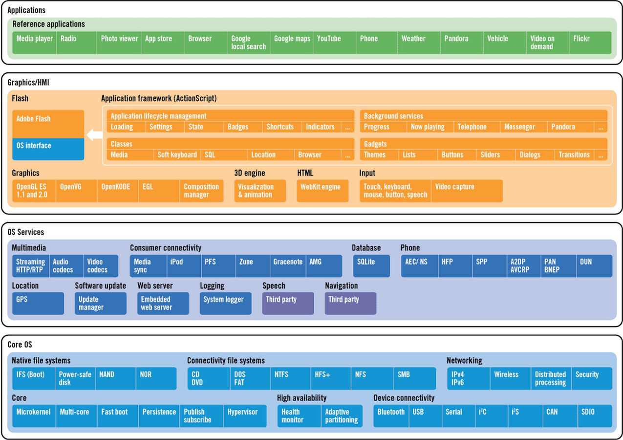 Концепция, создаваемая ng Connect Program, называется просто и понятно: LTE Connected Car. В её основе лежит операционная система QNX Neutrino, легко адаптирующаяся к любой аппаратной конфигурации. На «каркас» Neutrino уже штатно «надеты» мультимедийная оболочка, средства обработки звука, технология Adobe Flash-based HMI и несколько подпрограмм и утилит. В этой среде функционируют сервисы, поставщиками которых являются участники ng Connect Program. Приведём несколько примеров.