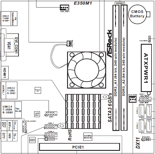 Комплектация платы совершенно не порадует покупателя — одного кабеля SATA явно недостаточно для типичного домашнего развлекательного центра, в котором, помимо основного накопителя, используется DVD-привод — для него нужен второй SATA-кабель. Кроме того, в зависимости от выбранного блока питания, пользователю может понадобиться один или два переходника питания для SATA-устройств. ![]() Содержимое DVD-диска претензий не вызвало: на нем записан полный набор драйверов для всех версий Windows (включая XP), а также фирменные утилиты ASRock. Тут же отметим, что команда «Установить все» действительно устанавливает все подряд с диска: драйверы, утилиты и ПО, что в некоторых случаях довольно неудобно. ![]() ⇡#Плата ASRock E350M1Основная особенность дизайна платы заключается в наличии слота PCI Express x16, что позволяет пользователю добавить в систему внешнюю видеокарту. Причем установка последней потребует более габаритного корпуса, и этот вопрос необходимо решить до непосредственной сборки системы. ![]() Еще один важный вопрос касается уровня шума системы. На плате установлена несколько назойливая 40-мм «жужжалка», которую, впрочем, легко можно заменить на низкопрофильный 90-мм вентилятор. Причем такой вентилятор уместится и на более высокий радиатор чипсета. И тут же отметим, что для полностью бесшумной системы мы рекомендуем корпус с «ноутбучным» безвентиляторным БП. Такое решение на 200-300 рублей дороже, зато полностью исчезает один из источников шума. Если же необходимо реализовать более эффективное охлаждение, то можно воспользоваться двумя дополнительными разъемами для подключения вентиляторов, один из которых 4-контактный, а другой 3-контактный. ![]() Что касается подсистемы памяти, то на плате установлено два 240-контактных слота DIMM, которые предназначены для модулей памяти DDR3. Максимальная частота памяти равна DDR3-1066 МГц, а максимальный общий объем достигает 16 Гбайт. ![]() Под слотами DIMM находятся четыре порта SerialATA 6 Gb/s. Всего южный мост Hudson FCH поддерживает шесть таких портов, но инженеры ASRock реализовали только пять (пятый выведен на заднюю панель). Также на плате разведены 10 из 14 поддерживаемых чипсетом портов USB 2.0, шесть из которых выведены на заднюю панель платы, а еще четыре подключаются при помощи планок (нет в комплекте). На плате установлен гигабитный сетевой контроллер RTL8111E ![]() и 8-канальный HD звуковой контроллер ALC892. ![]() Что касается задней панели, то на ней расположились три видеовыхода (VGA, DVI и HDMI), а также порты USB, аудиовыходы и порт SATA. Кроме этого, плата поддерживает последовательный порт, однако он подключается при помощи планки, которой нет в комплекте. Также на панели выводов находится порт PS/2, который позволяет подключать как мышь, так и клавиатуру. ![]() Схема платы: ![]()