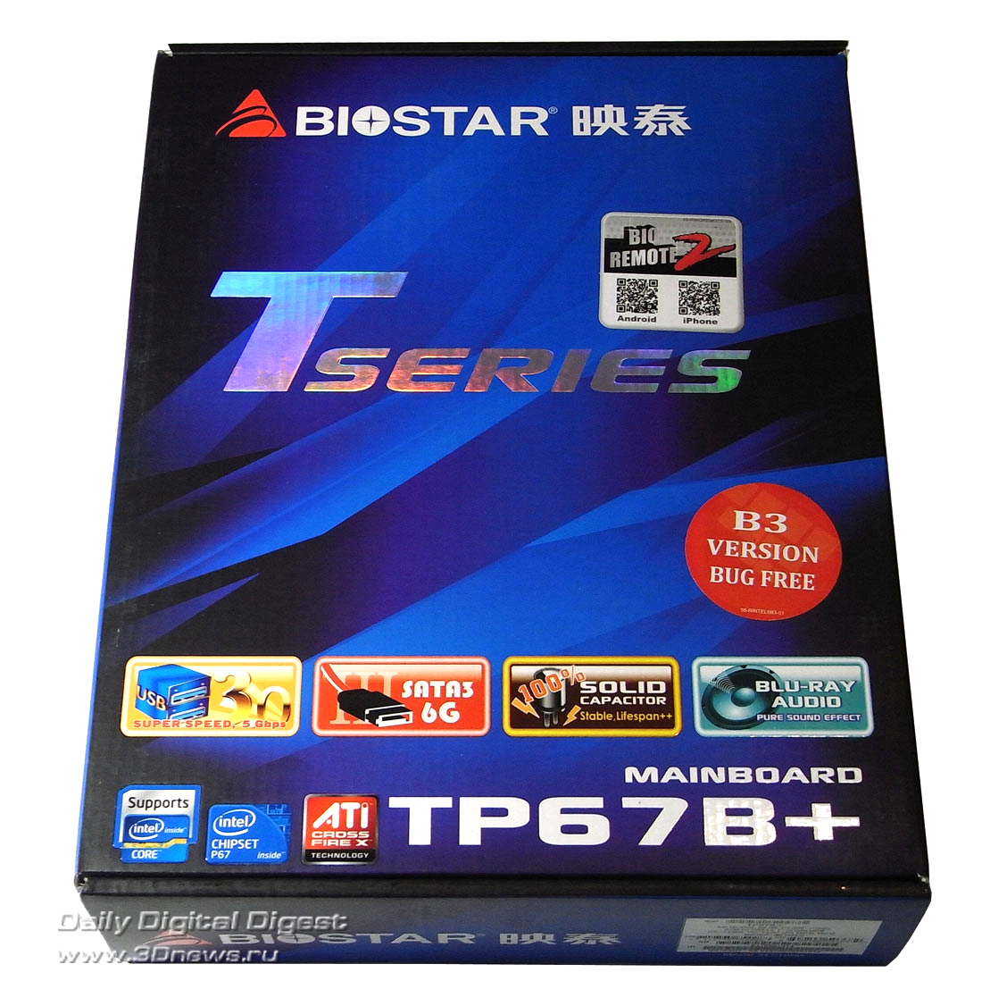 Проблемы с ревизией чипсета Intel P67 B2 значительно повлияли на весь рынок компьютерных комплектующих. Причем это касается не только материнских плат, но и прочих компонентов персонального компьютера. В результате возник так называемый «отложенный спрос» и большая часть пользователей стала ждать новую ревизию чипсета, и соответственно материнских плат на его основе. Весной 2011 года новая ревизия чипсета поступила производителям материнских плат, и они заново начали соревнование: кто первый выпустит соответствующие продукты. Первой оказалась компания Biostar, которая вывела на российский рынок целый ряд моделей как на чипсете P67 B3, так и на H67 B3. Тут стоит отметить, что основным направлением этого производителя являются платы начального и среднего уровня с соответствующим невысоким ценником. Эффект новизны платформы LGA1155 уже сходит на нет, что приводит к снижению розничной стоимости как самих процессоров, так и материнских плат. Модель Biostar TP67B+, например, продается в магазинах по цене около 3 500 рублей, что является одним из лучших предложений в данной категории. При этом сама плата выполнена в форм-факторе ATX, имеет пару слотов PCI Express x16 и поддерживает шину PCI. Единственным темным пятном в характеристиках продукта выглядит звуковая подсистема 5.1 вместо уже привычной 7.1. Действительно ли Biostar TP67B+ является настолько выгодной покупкой — мы расскажем в этом обзоре. ⇡#Спецификация Biostar TP67B+