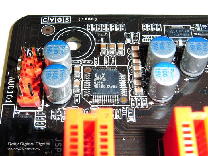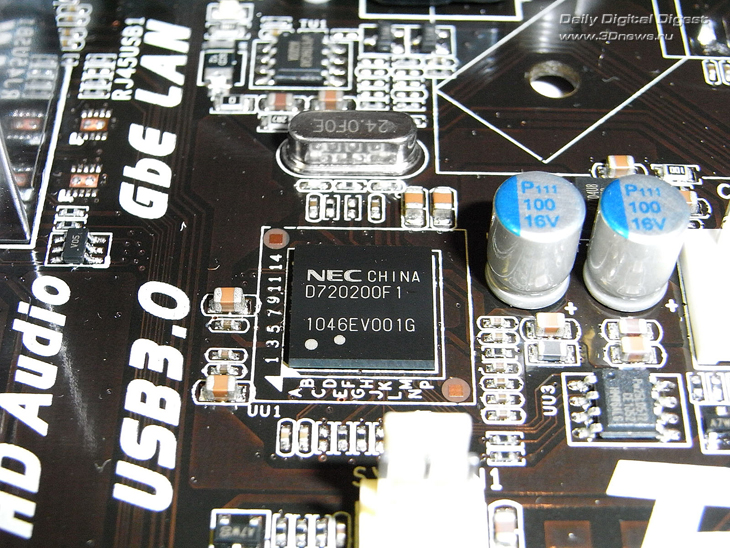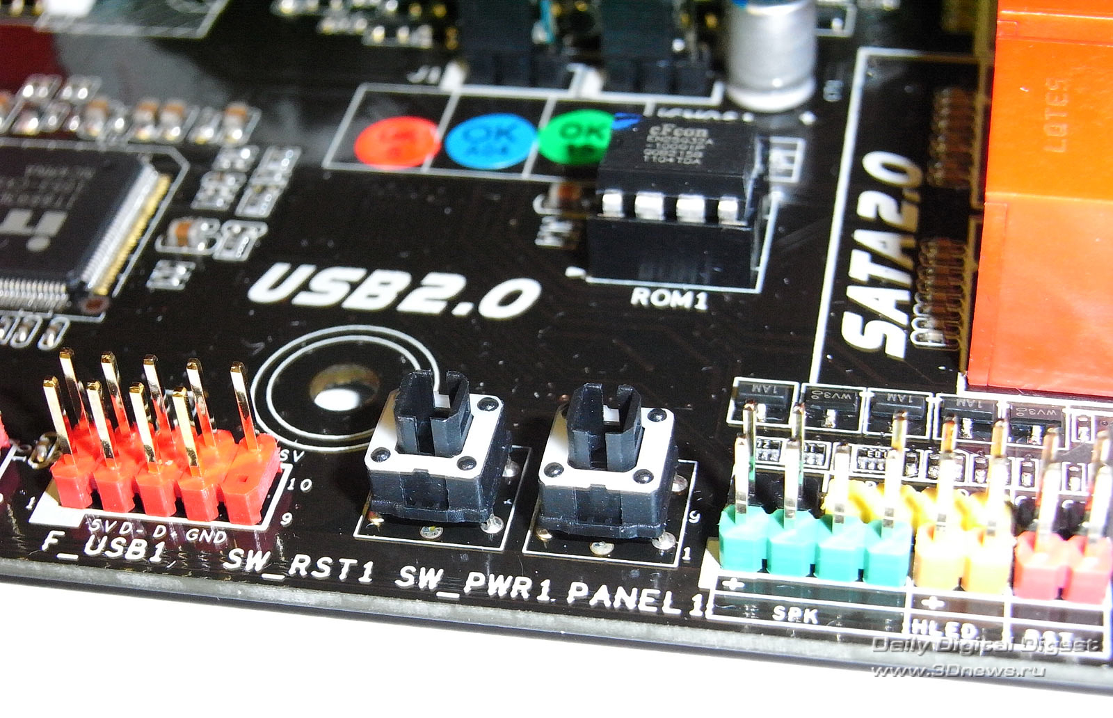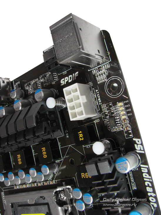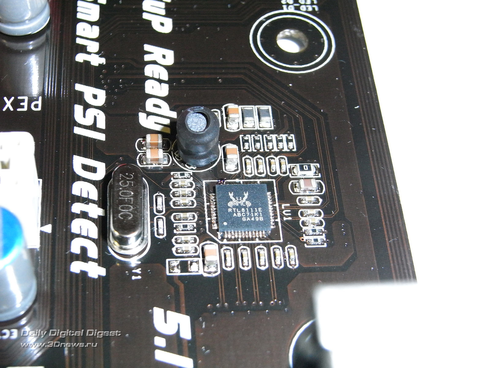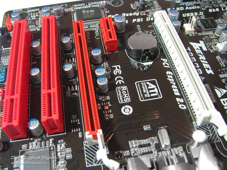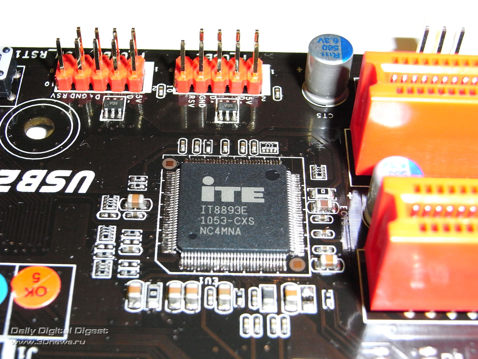 Перечисленный набор компонентов нельзя назвать богатым, однако, учитывая невысокую розничную стоимость платы, мы оцениваем его на твердую четверку. Тут же отметим, что для полной реализации всех возможностей Biostar TP67B+ пользователю придется докупить три кабеля SATA (и несколько переходников питания — в зависимости от конкретного БП), пару планок с внешними портами USB 2.0 (четыре порта) и, возможно, планку с COM-портом. Что касается содержимого DVD-диска, то к нему нет никаких претензий: присутствует полный набор драйверов, фирменных утилит Biostar и даже пробная версия антивируса BullGuard. Все ПО имеет следующий установочный интерфейс: ![]() ⇡#Плата Biostar TP67B+Характерными особенностями платы Biostar TP67B+ являются уменьшенные размеры (в глубину плата на один дюйм короче стандратных) и наличие пары слотов PCI Express x16. Впрочем, учитывая ценовую категорию платы, ее второй PEG-слот нужно рассматривать как некоторое бесплатное дополнение — большинство пользователей вряд ли им воспользуются. Но если владелец Biostar TP67B+ неожиданно получит еще одну видеокарту AMD (плата поддерживает только режим AMD CrossFireX), то ему стоит учесть, что на второй PEG-слот выделяется только четыре линии шины — плата не поддерживает конфигурацию 8+8. Тут же отметим, что на плате установлен один слот PCI Express x1 и пара слотов PCI. Причем функциональность последних обеспечивает дополнительный мост ITE IT8893E, поскольку в чистом виде поддержка этой шины отсутствует в P67/H67. Уменьшенные размеры платы не вызывают каких-либо затруднений при сборке системы. В частности, защелки слотов DIMM не блокируются первой видеокартой, а разъемы питания установлены по краям платы: основной (24-контактный) разъем расположен на нижнем краю, а дополнительный 8-контактный — на правом: Отметим, что плата сохранила обратную совместимость со «старыми» блоками питания и позволяет использовать их с кабелями 24 + 4. Рядом с процессорным гнездом установлен 4-контактный разъем CPU_FAN для процессорного кулера и свободный 3-контактный разъем SYS_FAN1. Кроме них, на левом краю платы установлен трехконтактный разъем SYS_FAN2. На плате распаяно четыре 240-контактных слота DIMM для модулей памяти DDR3. Они разбиты на две группы по два слота с чередованием цветов. Чтобы задействовать двухканальный режим, нужно установить модули в слоты одного цвета. Отметим, что плата поддерживает память стандарта DDR3-1066/1333 и позволяет увеличить частоту до 2200 МГц в режиме разгона. Максимальный объем памяти равен 16 Гбайт. ⇡#Возможности расширенияПлата Biostar TP67B+, благодаря чипсету P67, поддерживает четыре канала SerialATA 3 Gb/s и пару каналов SerialATA 6 Gb/s. Все порты расположены около чипсета и ориентированы параллельно плоскости платы. При этом порты 6 Gb/s окрашены в белый цвет, а порты 3 Gb/s красные. Также на плате установлено восемь портов USB 2.0: половина расположена на задней панели, а вторая половина подключается при помощи планок (отсутствуют в комплекте). Biostar TP67B+ поддерживает и шину USB 3.0 с помощью двухпортового контроллера NEC D720200F1. Оба порта выведены на заднюю панель. Плата Biostar TP67B+ поддерживает шестиканальный звук, а в качестве кодека используется чип ALC892. Это один из двух непонятных моментов: зачем использовать 8-канальный кодек и реализовать только шесть аудиовыходов? На плате установлен сетевой контроллер RTL 8111E (Gigabit Ethernet), подключенный к шине PCI Express (x1), а соответствующий разъем (RJ-45) вы