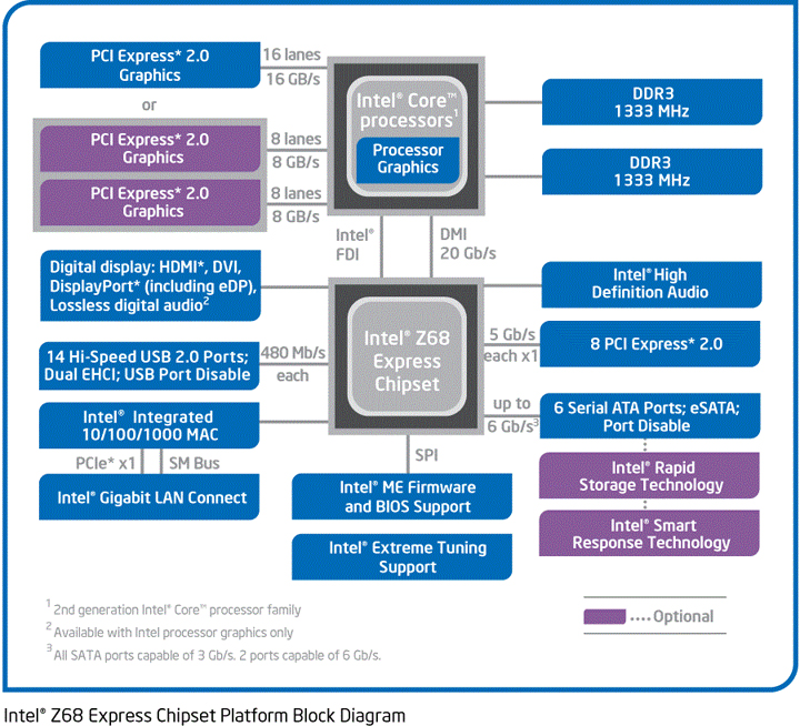 Завышенные ожидания могут навредить в любом деле. Даже если речь идёт не о новых технологиях и ИТ-продуктах, разочарование от несбывшихся надежд может легко заслонить любые положительные впечатления, сколь сильными бы они ни были — такова человеческая натура. А уж на компьютерном рынке таких историй — хоть отбавляй. За примерами ходить далеко не надо, сегодня речь как раз пойдёт об одном из них — о новом наборе системной логики для LGA1155-платформ Intel Z68 и об одной из первых плат Gigabyte на его основе. ⇡#Набор системной логики Intel Z68Про то, что анонсированные одновременно с процессорами Sandy Bridge чипсеты Intel P67 и Intel H67 будут не самыми старшими и продвинутыми вариантами в семействе Cougar Point, было известно с самого начала. Для энтузиастов был обещан специальный набор системной логики — Intel Z68, но о его базовых свойствах точных данных не сообщалось. Некоторые сетевые издания воспользовались информационным вакуумом и умело запустили утку о том, что главной чертой Z68 станут широкие оверклокерские возможности — якобы этот чипсет сможет вернуть возможность разгона для любых процессоров в LGA1155-исполнении. В эту историю поверили, и вот они — завышенные ожидания. Но что же мы получили на самом деле? ![]() Итак, выпущенный полторы недели назад Z68 действительно позиционируется как старший чипсет для процессоров Sandy Bridge. Однако при этом он продолжает оставаться представителем семейства Cougar Point, а значит, не вносит никаких корректив в общую архитектуру платформы. По этой причине на какие-то изменения в принципах разгона процессора надеяться бесполезно. Наиболее удручающая оверклокеров невозможность увеличения частоты базового тактового генератора (BCLK) — это не простая прихоть Intel, а результат того, что эта частота используется для тактования не только процессора, но и всей периферийной обвязки. ![]() Контроллеры внешних интерфейсов разгоняются крайне неохотно, это и приводит к неработоспособности LGA1155-систем при увеличении BCLK за штатные 100 МГц. Так что для улучшения разгона платы на Z68 ничего нового предложить не могут. Новизна же Intel Z68 заключается в другом. Первые наборы системной логики для Sandy Bridge, P67 и H67, предполагают слишком жёсткую сегментацию LGA1155-систем на те, что используют внешнюю графическую карту, и те, что нацелены на работу со встроенной в процессор графикой. Так, позволяющий использовать встроенное видеоядро Intel H67 начисто обделён средствами для изменения множителей частоты процессора и памяти, то есть принуждает к эксплуатации «железа» исключительно в штатном режиме. Альтернативный Intel P67, напротив, разрешает увеличивать коэффициенты умножения для частот процессора и памяти, но не даёт доступа к встроенному в процессор видеоядру. И, в принципе, это можно было бы считать вполне приемлемой жертвой, если бы не одно «но». В состав графического ядра процессоров Sandy Bridge входит чрезвычайно интересная технология Intel Quick Sync, включающая специализированные аппаратные блоки для кодирования и декодирования видео. Причём блоки эти обладают настолько высокой эффективностью, что перекодирование видео с использованием каких бы то ни было конкурирующих аппаратных решений выполняется в разы медленнее и требует гораздо больших затрат энергии. Однако эта технология, которую можно отнести к числу ключевых плюсов архитектуры процессоров Sandy Bridge, на плата