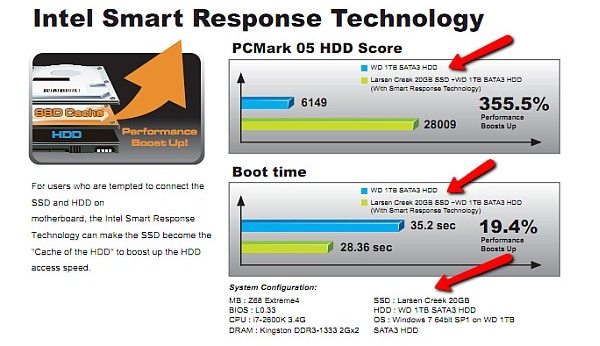 Все внешние интерфейсы остались ровно теми же, что и были раньше. Не появилось даже врождённой поддержки USB 3.0 портов, их Intel реализует в своих чипсетах только в следующем году, когда на рынок будут выходить процессоры семейства Ivy Bridge. Удивляться же тому, что на создание Intel Z68 у Intel ушло столько времени, тоже не следует. Задержка с появлением Z68 обусловлена в первую очередь тем, что производитель не хотел пятнать репутацию этого набора логики пресловутым SATA-багом. Новый набор системной логики сразу вышел в «правильной» ревизии B3, и любые платы, основанные на нём, никаких проблем с потенциальной деградацией SATA-портов не имеют изначально. Впрочем, чтобы Z68 не производил впечатления совсем уж микроскопичного шага вперёд, разработчики к аппаратным возможностям Cougar Point решили добавить пару программных, реализуемых через драйверы и дополнительные утилиты. Во-первых, в новом чипсете стала возможна виртуализация графических ускорителей — внешней видеокарты и встроенного в процессор графического ядра. Разработкой этой технологии, которая получила название Virtu, занималась компания Lucidlogic. ![]() Суть Virtu заключается в возможности перенаправления графической нагрузки на видеокарту или на встроенное в процессор графическое ядро в зависимости от её типа. В рамках платформ, построенных на Sandy Bridge, польза от этой технологии состоит в том, что программы для перекодирования видео могут использовать технологию Intel Quick Sync даже в том случае, когда в системе установлена внешняя графическая карта. Во-вторых, Z68 стал обладателем технологии Intel Smart Response. Это — новый режим работы встроенного в чипсет RAID-контроллера, в котором массив собирается из SSD- и HDD-дисков, и скоростной твердотельный накопитель служит для кеширования обращений к медленной «магнитной» дисковой подсистеме. В результате ёмкость такого массива соответствует объёму участвующих в нём HDD-дисков, а скорость операций при работе с закешированными данными увеличивается до принципиально более высокого уровня, приближающегося к быстродействию SSD. ![]() Хотя обе технологии, Lucidlogic Virtu и Intel Smart Response, являются полностью программными, их работоспособность жёстко привязана к Intel Z68. Реализующее их программное обеспечение работает только на платах на этом чипсете, а потому они относятся к его особенностям, выделяющим Z68 на фоне других членов семейства Cougar Point. ⇡#Дизайн и возможностиТак уж сложилось, что первой материнской платой на базе нового интеловского чипсета, попавшей в нашу лабораторию, стала Gigabyte GA-Z68X-UD5-B3. Эта материнская плата сразу же производит очень хорошее впечатление. С выходом Sandy Bridge разработчики Gigabyte нашли новый стиль для своих топовых продуктов — платы делаются на чёрном, покрытом матовым лаком текстолите и оснащаются слотами чёрного цвета. Выглядит это очень круто, с первого взгляда возникает ощущение, что имеешь дело с продуктом высокого класса. Рассматриваемая Gigabyte GA-Z68X-UD5-B3 действительно не из дешёвых. Она относится к классу UD5, а это — почти что самый дорогой представитель в линейке плат Gigabyte на Intel Z68. При этом нельзя сказать, что возможности у GA-Z68X-UD5-B3 избыточны. Она, конечно, не лишена дополнительных контроллеров, но их немного: помимо обязательных для любой платы сетевых и звуковых чипов добавлены только микросхемы, обеспечивающие работу портов USB 3.0, IEEE1394 и eSATA. Зато на GA-Z68X-UD5-B3 р