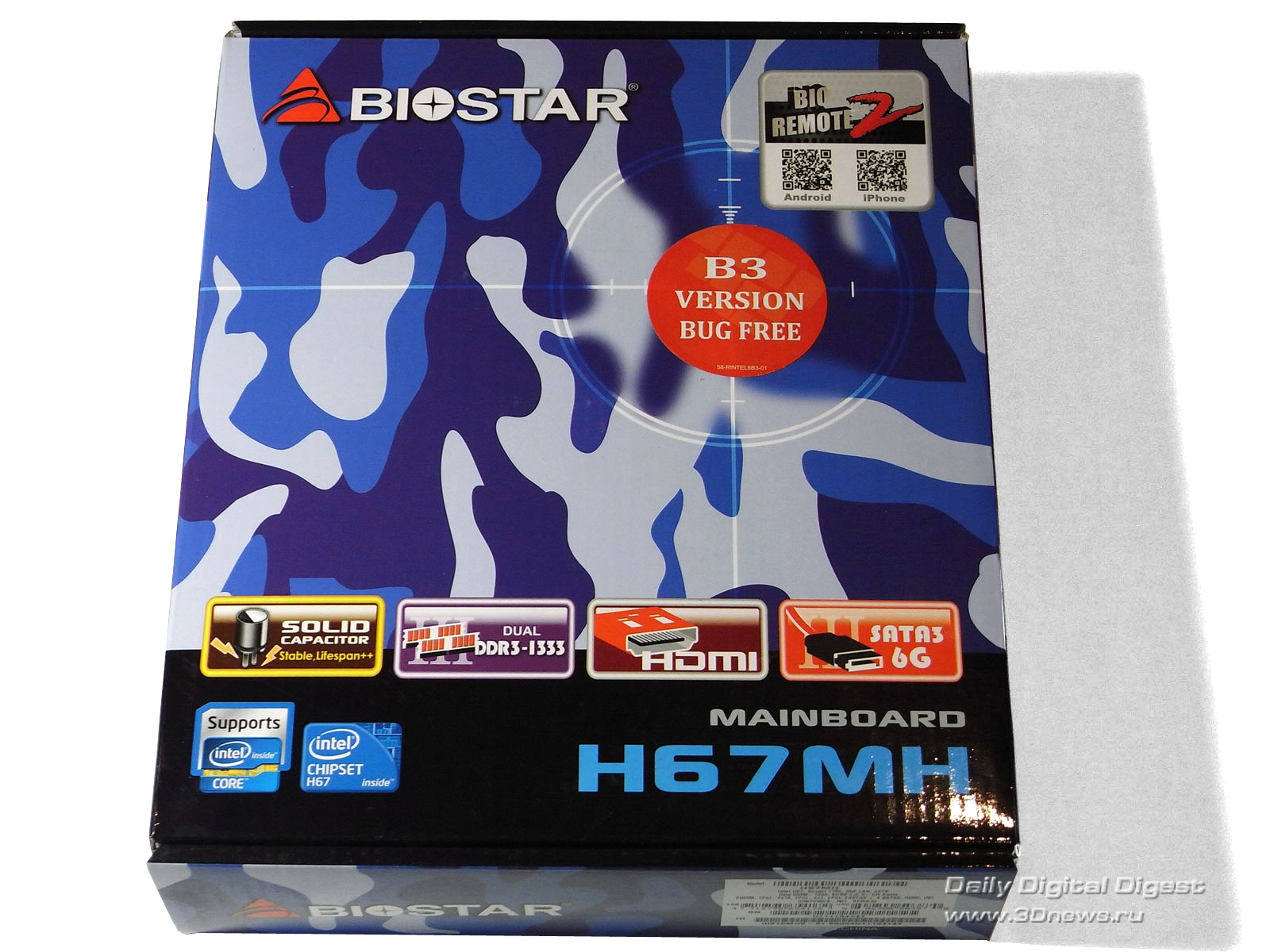 Коробка с Biostar H67MH имеет специальный логотип, указывающий на ревизию B3 чипсета Intel H67. В коробке можно обнаружить следующее: