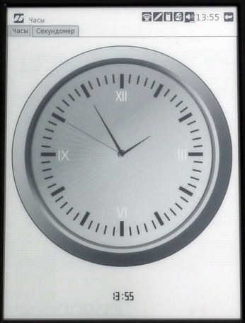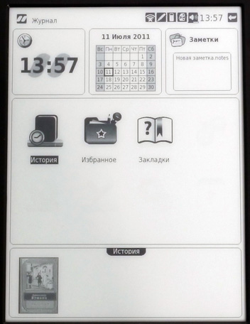 Большинство элементов, конечно, достаточно крупные, и промахнуться мимо них будет нелегко. На главном экране есть три раздела. Вверху показываются часы, календарь и заметки — это фактически быстрый доступ к соответствующим функциям. В середине — главное меню, а в самом низу — список последних открытых файлов. Ну и в самом верху есть узкая полоска, которая всегда присутствует на экране. Там находятся иконки-индикаторы различных параметров устройства — по нажатию показывается соответствующее меню или диалог для настройки этих самых параметров или же для доступа к некоторым другим функциям. В общем, некий аналог области уведомлений или панели задач. Самая левая иконка служит для вызова меню текущего открытого приложения. Концепция вполне понятная, хотя видеть её в читалке непривычно.