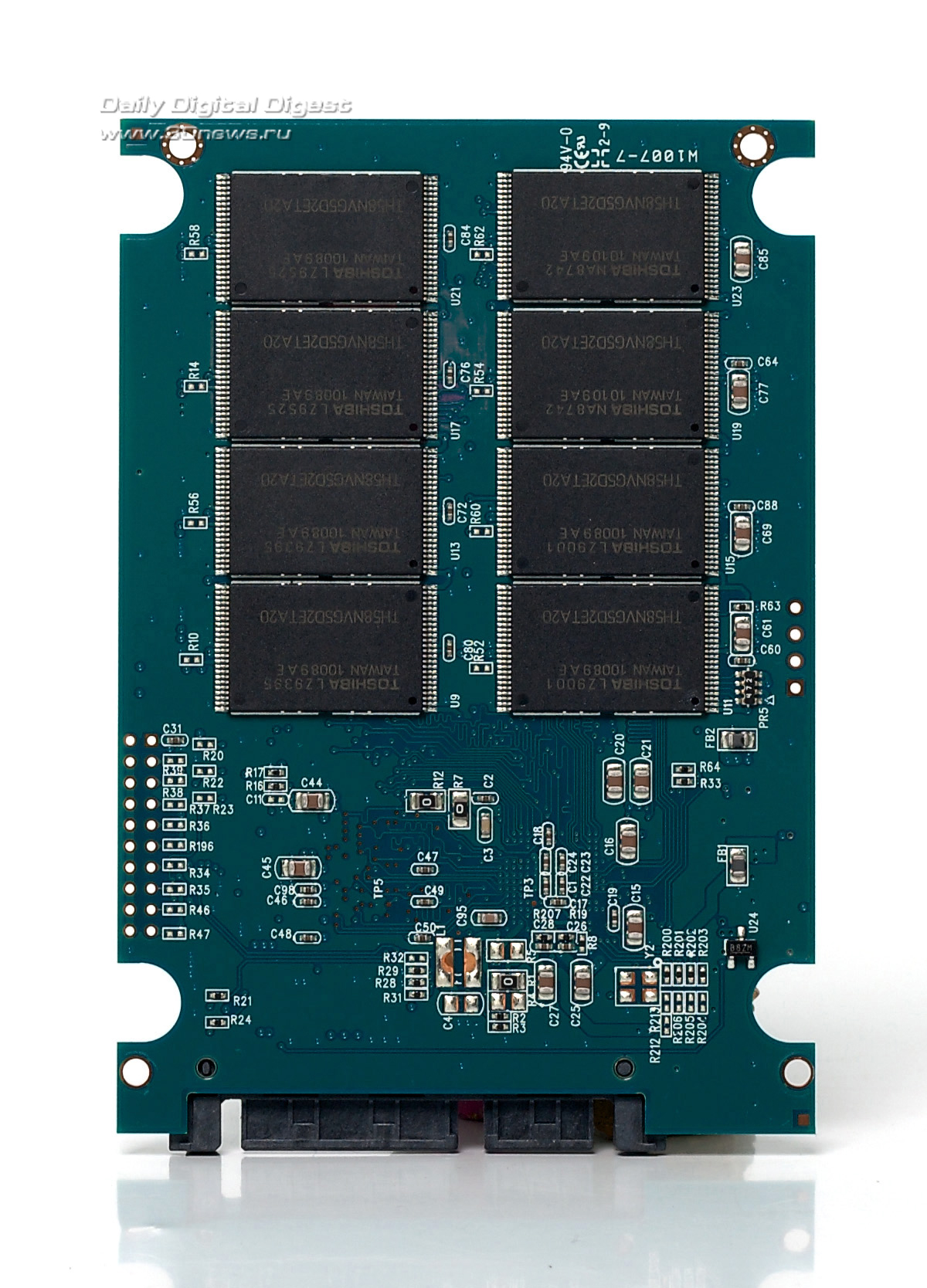 В линейке SSDNow V используется контроллер JMicron JMF618. Этот чип, несмотря на свой возраст, поддерживает команду TRIM и обеспечивает неплохую для интерфейса SATA 2 скорость последовательного чтения — 200 Мбайт/с. Запись происходит гораздо медленнее и сильно зависит от объема накопителя. Старшая модель выдает лишь 160 Мбайт/с, что под силу даже быстрым жестким дискам, производительность младшей — скромные 50 Мбайт/с. Уровень средней модели (64 Гбайт) — 110 Мбайт/с, и именно с ней нам предстоит познакомиться поближе. Серия SSDNow V+ перешла на контроллер Toshiba T6UG1XBG, который также поддерживает TRIM, а заодно — активную фоновую очистку от мусорных данных. Для всех моделей на его основе заявлена скорость последовательного чтения 230 и записи — 180 Мбайт/с. Точно такой же контроллер используется в накопителях MacBook Air прошлогодней версии: он приглянулся Apple именно благодаря эффективному алгоритму сбора мусора, так как в то время Mac OS X еще не поддерживала TRIM. Представлять линейку SSDNow V+ в тестировании будет привод объемом 256 Гбайт. ⇡#Комплект поставки, конструкция64-гигабайтный SSDNow V нам прислали в составе комплекта для апгрейда настольных ПК: помимо самого привода, в коробке нашлись металлические планки для установки в отсек 3,5 дюйма, комплект винтиков и проводов, а также диск с ПО для клонирования дисковых разделов Acronis True Image HD. Такой набор, а также аналогичный для ноутбуков (с USB-боксом) стоит около пяти тысяч рублей. SSDNow V+ на 256 Гбайт прибыл в минимальной комплектации, без всяких аксессуаров. В такой поставке он стоит от 12 тыс. рублей в столичных интернет-магазинах. Накопители имеют одинаковые металлические корпуса с серой зернистой поверхностью. От шаловливых ручек внутренности SSD защищены винтами с шестигранным шлицем. На плате SSDNow V распаяны 16 микросхем MLC NAND от Toshiba. Они произведены по техпроцессу 42 нм, что нынче уже редкость. Контроллер JMicron JMF618 также несет бледную маркировку Toshiba и работает в паре с буфером SDRAM объемом 64 Мбайт. Плата SSDNow V+ выглядит совсем по-другому. На ней всего восемь микросхем, произведенных по техпроцессу 43 нм. Контроллер Toshiba T6UG1XBG использует в качестве буфера 128 Мбайт памяти DDR.