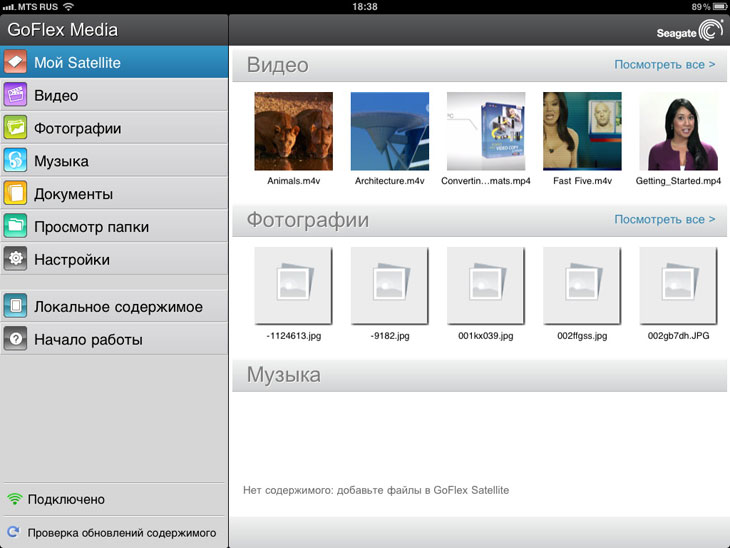 Закачивать контент на GoFlex Satellite проще простого — присоединяем переходник, подключаем устройство к компу (в этот момент WiFi-соединение с мобильными клиентами пропадает) и копируем файлы. Делать это, а равно как и удалять их с диска, можно только при подключении к ПК. Диск изначально небыстрый, — 5400 об/мин, но на скорости вроде 70 Мбайт/с при записи и 80 Мбайт/с при чтении расчитывать можно (тут мы говорим о USB 3.0). Диск из коробки отформатирован под NTFS, в память записана утилита для переформатирования в HFS+.